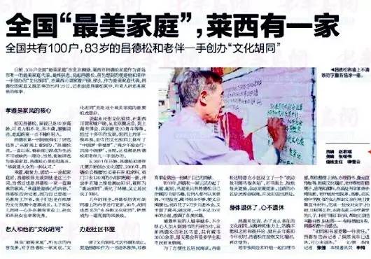 昌德松是青島市萊西市院上鎮(zhèn)中學(xué)退休教師,2001年起,他和老伴兒開始創(chuàng)辦文化庭院,積極營造家庭文化氛圍,在粉刷后的墻上書寫古今詩詞、格言名句、繪制壁畫等。2008年奧運會期間,昌德松自掏腰包買來石灰和涂料,將門口長120米的小胡同粉刷一新,并親手在墻上描繪奧運知識,被鄰里街坊稱為“奧運胡同”,慕名來參觀的人絡(luò)繹不絕。如今,這條文化胡同仍是萊西當(dāng)?shù)匾坏烂利惖娘L(fēng)景線。
