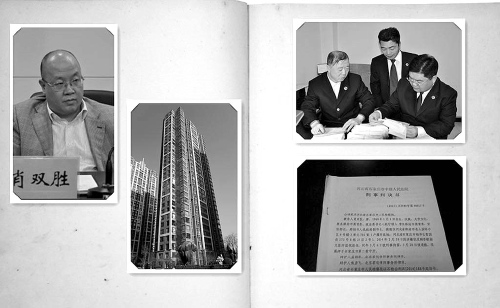 左上:肖雙勝其人;左下:肖雙勝超低價買房的樓盤;右上:辦案檢察官查賬;右下:一審判決書