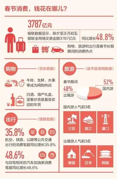 7天假期已經(jīng)結(jié)束,中國人的消費清單也逐漸出爐。下面,就請跟著小編一起,看看這個春節(jié)大家是怎么消費的吧!
