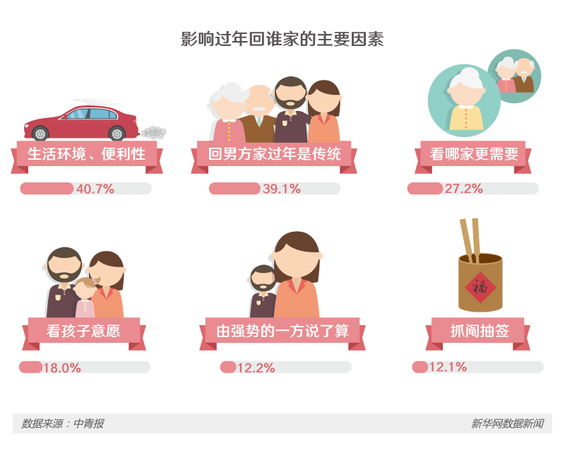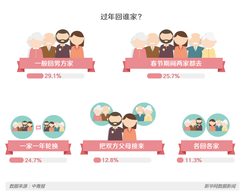 相關調查數據顯示,將近30%的受訪者表示目前一般都是回男方家過年;但實際上,大部分人心里都希望采取“輪流制”,一年一家,或者干脆把父母接過來一起過年,但考慮到父母身體條件或自身居住條件等原因,只得作罷。
