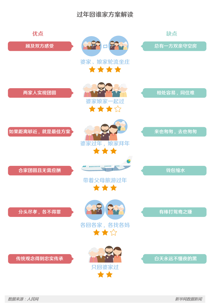 夫妻爭著回自己家陪父母過年,出發點都是為了盡孝,但若因此導致感情出現問題,甚至讓婚姻出現危機,就未免舍本逐末。在此小編就對夫妻過年回家的幾種解決方案做個“評估”,供大家參考: