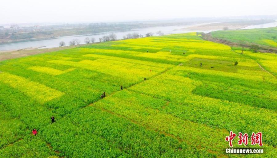 2017年2月3日,當日立春。航拍下的江西省新余市渝水區新溪鄉萬畝油菜花基地風光秀麗,金燦燦的花朵陸續綻放迎春。隨著氣溫逐漸回升,江西省各地鄉村花開遍野、黃綠相間、鴨群戲水,吸引眾多游客前往踏青賞花,采擷春光。 趙春亮 攝