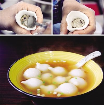“南方的湯圓做法像包餃子!崩习迥镆贿吅兔嬉贿吔榻B。先把糯米粉加水和成團,放置幾小時讓它餳透。趁面還在餳著,可以著手準備各種餡料,有芝麻豬油餡、筍干餡和香菇餡!皽珗A餡含水量比元宵多,這是兩者的區(qū)別之一,在做法上,兩者也有很大區(qū)別!崩习迥镎f。