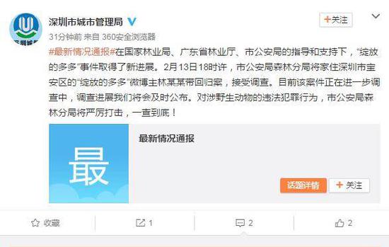 深圳市城市管理局官方微博2月14日消息,在國家林業局、廣東省林業廳、市公安局的指導和支持下,“綻放的多多”事件取得了新進展。2月13日18時許,市公安局森林分局將家住深圳市寶安區的“綻放的多多”微博主林某某帶回歸案,接受調查。目前該案件正在進一步調查中,調查進展我們將會及時公布。對涉野生動物的違法犯罪行為,市公安局森林分局將嚴厲打擊,一查到底!