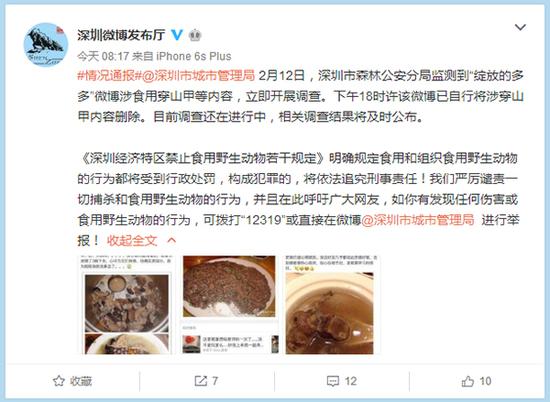 2月13日上午,廣東省深圳市互聯網信息辦公室官方微博“深圳微博發布廳”發布微博稱,12日,深圳市森林公安分局監測到網友“綻放的多多”微博涉食用穿山甲等內容,立即開展調查。當天下午18時許該微博已自行將涉穿山甲內容刪除。目前調查還在進行中,相關調查結果將及時公布。