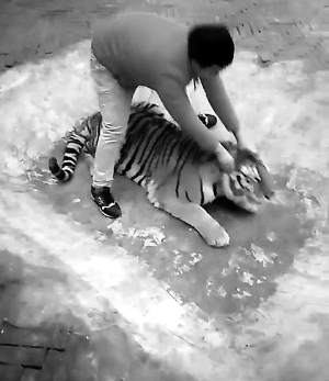 “與老虎待在一起很久,并不擔心老虎會攻擊或傷害,”他的語氣中透露著自信,在聊天中,他似乎并未意識到自己的行為存在虐待動物的嫌疑,他表示動物園也沒有反對這種行為,還表示類似的視頻每天都會拍。