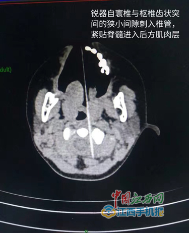 當班醫(yī)生于第一時間請來擅長治療上頸椎病的姚浩群副主任醫(yī)師會診。據(jù)姚主任根據(jù)CT平掃判斷,竹簽經(jīng)寰椎與樞椎齒狀突之間的狹小間隙刺入椎管,緊貼脊髓進入后方肌肉層。“竹簽已經(jīng)貫通椎管,并且所在的椎管正是呼吸、心跳等生命中樞所處的位置,因此如果進行這一位置的異物取出,孩子隨時可能有生命危險。”南昌大學第一附屬醫(yī)院姚浩群副主任醫(yī)師對王女士解釋道。