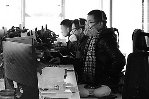 沿著數(shù)列長(zhǎng)條形的辦公桌望過(guò)去,幾乎一半的員工都戴著口罩。午休時(shí)間,兩名女員工甚至戴著防毒面具,在座位上睡覺(jué)。記者發(fā)現(xiàn),戴有類似防毒面具的員工不下10人。
