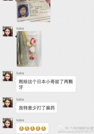 劉醫生:其實根本沒有少打麻藥。我很負責的把那個日本小伙子的牙拔了,他并無任何疼痛,走的時候還感謝了我。不過我承認自己是有點無聊,看到日本人,而且還帶著護照,就想和別人開個玩笑。就拍了張照片,然后發在了一個微信群里,想和大家調侃一下,就說少打麻藥了,就是無聊的心理。