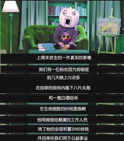 當天晚上10點,王尼瑪在節目中提到,上周末發生的一件真實的事情,一位粉絲男孩因為抑郁癥,前幾天晚上12點多,在自家的陽臺上吞服了八片頭孢和一瓶白酒后意欲自殺。在生命倒數的時間里,這位男孩通過微信給暴漫的工作人員轉了他全部的積蓄2000元錢,并拜托用于公益事業。