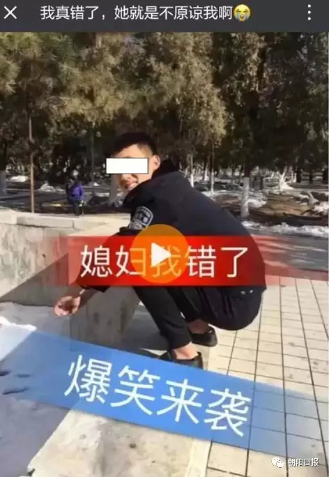 2月25日下午,一個名為“我是XX”(名字帶有侮辱性)的網民身著沒有警銜警號的“警服”,在朝陽市人民公園的一座雕塑下錄制了一段名為“我真的錯了,她就是不原諒我啊”的搞笑視頻,視頻大致內容是自己做錯了事,向媳婦認錯。