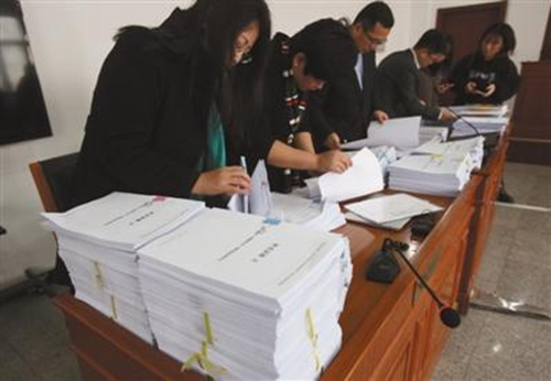 2017年2月15日,《錦繡未央》被訴侵權案交換證據,原告方提交的證據擺滿了原告席。新京報記者 王貴彬 攝。圖片來源:新京報