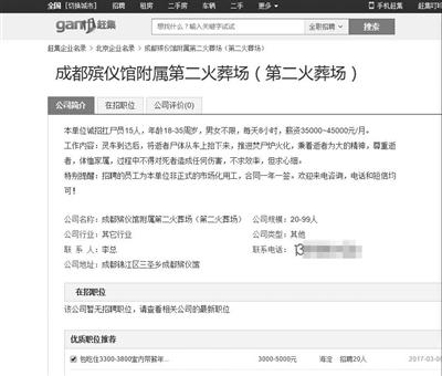 成都一家殯儀館工作人員介紹,他們目前僅有“運尸員”這一崗位,“但這個崗位屬于事業編制,招聘都是通過殯儀館官方網站進行的,還需要審查,不會隨意發在這些網站上。”工作人員同時介紹,即使是正規“運尸員”,也絕非高薪,“月薪過萬是不可能的,肯定是騙人的”。