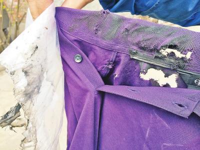 昨天上午10時,記者見到了這些被損壞的衣物。牧先生拿著一件被絞了11個口子的紫色T恤說,他平時利用業余時間,在朋友圈里賣一些衣物。今年2月4日,因客戶需要,他通過申通快遞的業務員,把兩件國外進口的T恤衫、一個手提皮包和一只旅行水壺,從鄭州市中原區寄給住在二七區的客戶。2月7日,他接到申通快遞員的電話,說這些衣物被拒收退貨了。他與客戶取得聯系后,對方十分氣憤,說他寄來的衣物,包裝袋上全是機油,里面的衣服有多處爛口子,皮包上有明顯的劃傷,金屬水壺也癟了一個大坑。