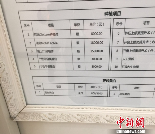 圖為北京一私立醫(yī)院的種牙項(xiàng)目價(jià)格。呂春榮 攝