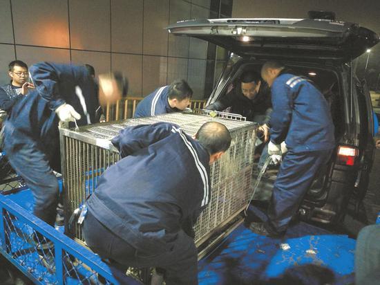 經過近一個半小時的空中旅行,剛下飛機的“蜀蘭”還有一點驚慌。面對機場運輸工作人員,她有些焦慮地在籠子里轉來轉去,變換姿勢。