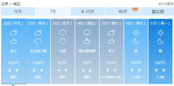 上周的北京暖意融融,春天似乎已經(jīng)近在咫尺,然而昨日的一場冷雨,打亂了北京進(jìn)入氣象意義上春天的步伐。根據(jù)未來7天天氣預(yù)報(bào),北京本周仍以多云到陰為主,周三、周四、周五或還有降水天氣過程,其中周五的最高氣溫或降至5℃,最低氣溫則有可能被打回0℃,寒意明顯。
