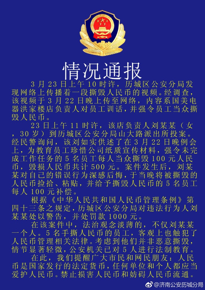 中新網3月23日電 據濟南市公安局歷城區分局官方微博消息,今日,歷城區公安分局就網上傳播的一段撕毀人民幣的視頻進行調查。調查結果顯示,視頻內容系國美電器洪家樓店負責人對員工進行訓話,并強令員工當眾撕毀人民幣。歷城區公安分局對違法行為人劉某某處以警告,并處罰款1000元。