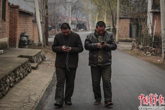 北京通州西集鎮尹家河村,工地因下雨停工。兩名來自內蒙古赤峰的打工者用手機聽廣播。