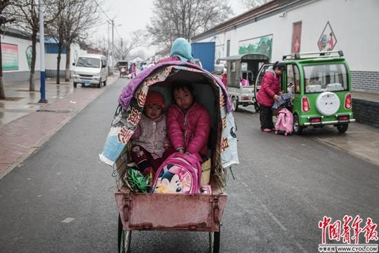 河北省香河縣王店子村二年級的王欣茹(右)和妹妹坐在奶奶的三輪車上放學回家。她們的父母都在香河縣城工作,平時由奶奶照看。