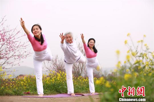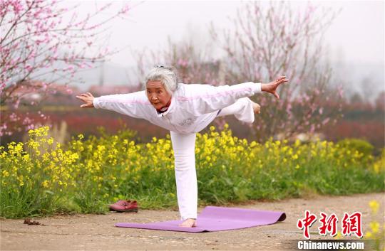 中新網襄陽3月29日電(周政 丁心栓)從61歲接觸瑜伽至今,湖北襄陽75歲老太康光英練就了一身硬本領。羅漢睡式、鶴式、駱駝式、肩倒立式……瑜伽中的幾個高難度動作,她施展起來毫不費力,還能輕松劈下“一字馬”。