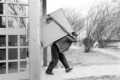 3月19日,庹師傅從北京五環外一棟居民樓里把衣柜背出來,長條綁帶包著衣柜更容易著力,但衣柜還是把他的腰壓得深彎下去。本報記者 吳凡 攝