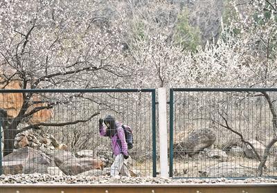 隨著北京入春,居庸關的山花也進入了花期。昨日上午,北京青年報記者來到花海所處的鐵路路段——京包鐵路59公里至61公里之間。可以看到,山桃花已經開放,而山杏花還未完全開放。但這并沒有阻擋攝影愛好者的熱情,向山上望去,不時有人從樹林中冒出頭,伸出攝影器材的“長槍短炮”。為了拍一張列車穿過花海的照片,很多游客甚至進入鐵路軌道,這種行為每天都在上演。