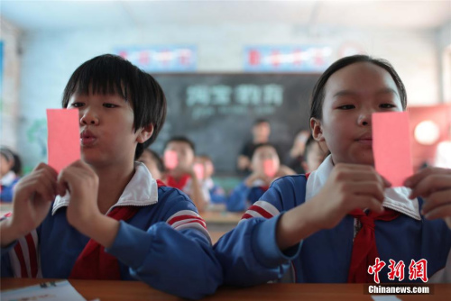 資料圖:“云端課堂”的普通話課上,學生們正用嘴對著紙片做爆破音練習。 馬義恒 攝