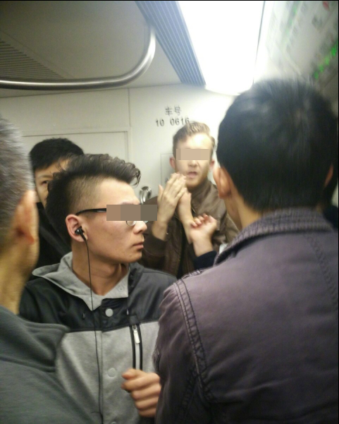 據@北京人不知道的北京事兒,網友爆料,4月6日,地鐵十號線宋家莊開往國貿方向,早高峰時一名外國男子帶著一位女孩靠門席地而坐,中國小伙子用英語請他倆站起來,結果被罵被打。