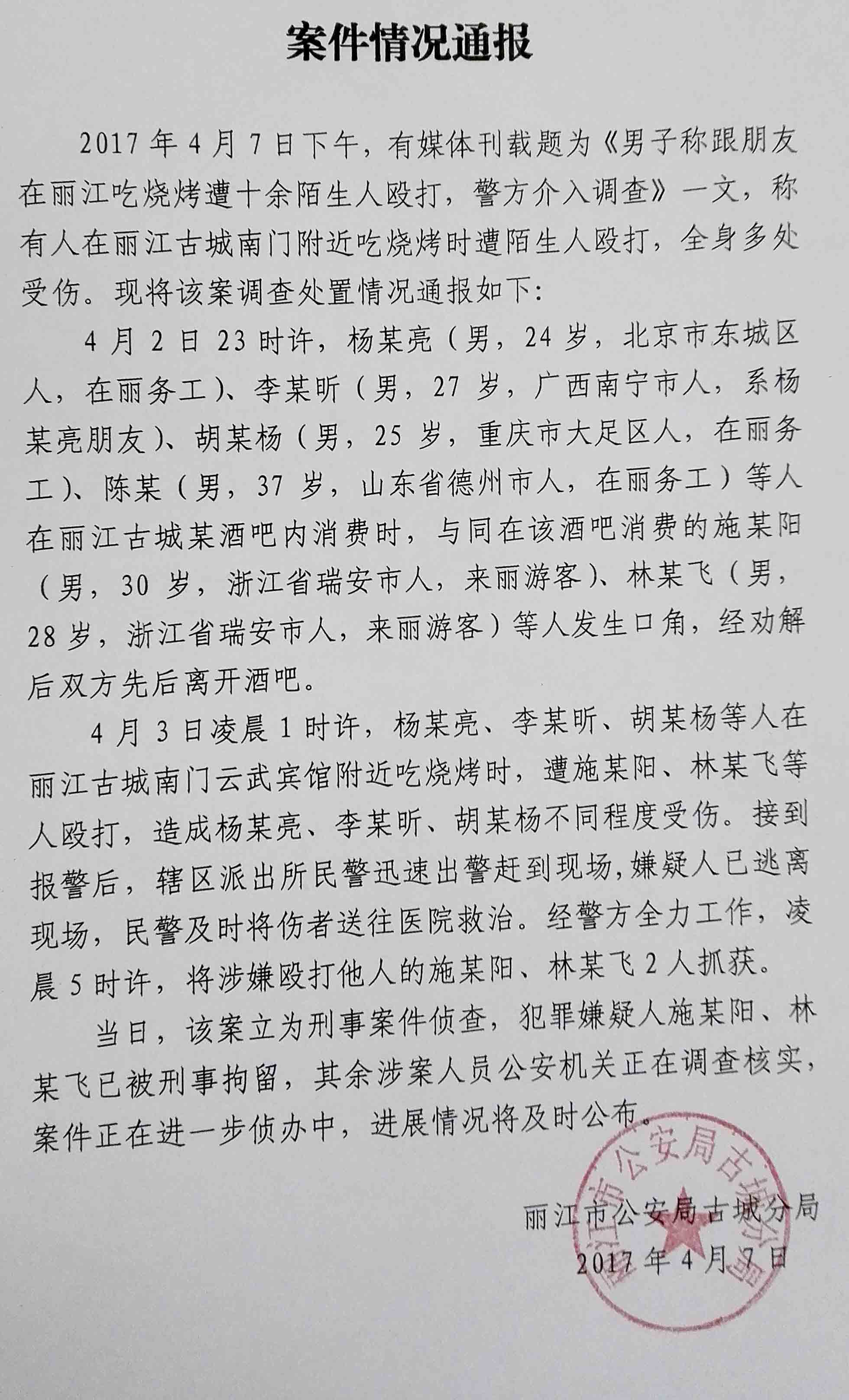 4月7日,有媒體報道一男子在麗江吃燒烤時被十余人毆打,造成全身多處受傷。下午,麗江市公安局古城分局就此案調(diào)查處置情況做出了通報: