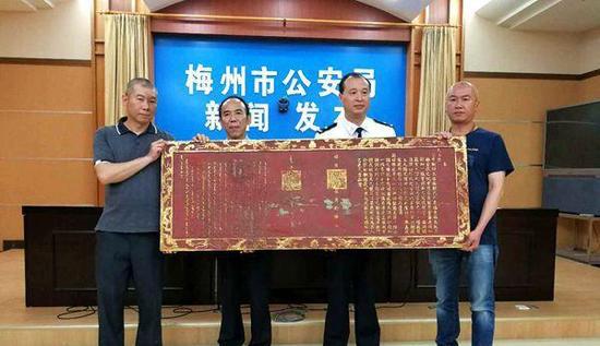 3月21日,梅州市公安局收到梅江區(qū)三角鎮(zhèn)大壢村蘭軒公祠葉氏宗族人員和海外鄉(xiāng)親聯(lián)名來(lái)信,反映清代圣旨匾額被盜情況。據(jù)葉氏宗親介紹,其先祖葉舒華在約150年前的清代任朝庭官員,因政績(jī)非凡受朝庭褒揚(yáng),先后獲授咸豐、同治皇帝圣旨匾額共3塊,另有3副共6塊的對(duì)聯(lián)豎匾、1塊清末翰林游顯廷題寫“退一步想”的橫匾。上述匾額的市場(chǎng)估值近百萬(wàn)元,一直交由族中人員葉某勝代為保管,發(fā)現(xiàn)被盜后向公安機(jī)關(guān)報(bào)案。