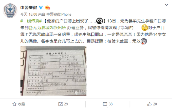 13日,安徽省蕪湖市無為縣的梁先生,拿著戶口簿來到無為縣城郊派出所辦理業(yè)務(wù)。民警驚奇地發(fā)現(xiàn)了手寫的一頁……姓名寫的是權(quán)某某,出生地韓國首爾,職業(yè)欄填的“歌手、音樂制作人”……對于戶口簿上無緣無故出現(xiàn)一名明星,梁先生脫口而出,一定是權(quán)某某!因?yàn)樗?4歲女兒的偶像。名字也是女兒寫上去的。