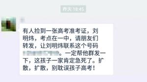 即將迎來今年的高考,而日前網上一條“劉明煒同學準考證丟失”的信息在朋友圈和微博上瘋轉。信息中稱,劉明煒是一中學生,丟失了準考證,希望好心人撿到后與其聯系,不要耽誤孩子高考(見圖)。不過記者發現,從2011年起,網上就出現過“白婭倩”、“劉明煒”等同學丟準考證的信息,準考證的種類也包括中考證和高考證兩種。目前,北京網警官方微博對此辟謠,提醒網友不信謠、不傳謠、不造謠。