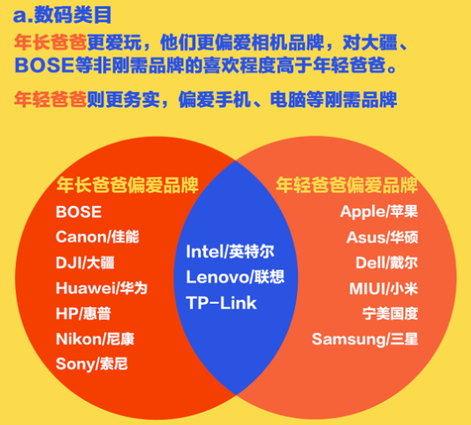 在最愛購買的品牌上,年長爸爸和年輕爸爸自然表現出不同的品味。購買數碼產品時,年長爸爸更熱衷于潮流和高生活品質,他們喜歡佳能、索尼、尼康等相機品牌,對大疆、BOSE等非剛需的喜歡程度也高于年輕爸爸。而年輕爸爸則更務實,喜歡手機、電腦等剛需品牌,例如蘋果、小米、華碩、戴爾等。畢竟,年輕人還需腳踏實地奮斗,而年長爸爸們可以慢下來享受生活了。