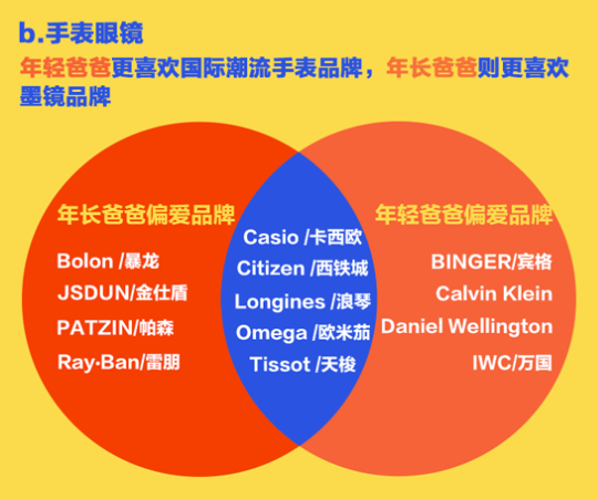 在手表眼鏡類中,年輕爸爸比年長爸爸顯得更時髦,他們更喜歡近幾年風靡的國際時尚品牌,例如DW、CK等,年長爸爸則更偏向購買墨鏡品牌。