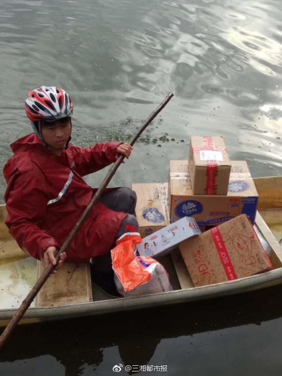 【暴雨襲湘 小哥劃船送快遞】入汛以來最強降雨過程持續“發力”,湖南多地受災。在益陽,大雨已經持續了3天以上,老城區煤電公司家屬安置區的門口,積水已有大腿深。快遞小哥鐘高租來漁民的小船,給住在安置區的老人送去快遞。不容易,送快遞也要自帶劃船技能。