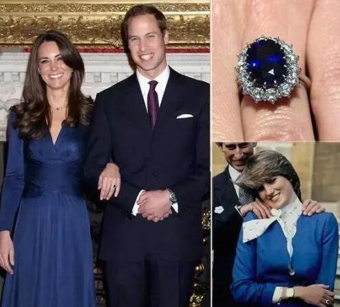 而后凱特王妃的訂婚戒指正是戴安娜王妃1981年的訂婚戒指,是枚白金藍寶石戒指,中間是一顆18克拉橢圓形藍寶石,周圍鑲14顆小鉆石。