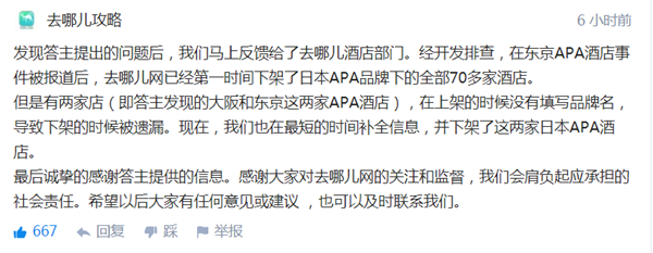 近兩日在網上鬧得沸沸揚揚的APA酒店“重現(xiàn)事件”有了新轉機。有記者在13日16時許登錄知乎,發(fā)現(xiàn)去哪兒駐知乎官方賬號“去哪兒攻略”在知乎答主王瑞揚回答下方的評論區(qū)回應道,經排查,在東京APA酒店事件被報道后,去哪兒網已第一時間下架了日本APA品牌下的全部70多家酒店,但有兩家店(即答主發(fā)現(xiàn)的大阪和東京這兩家APA酒店)在上架時沒有填寫品牌名,導致下架時被遺漏。現(xiàn)在,去哪兒網已經補全信息,并下架了這兩家酒店。(環(huán)球網)