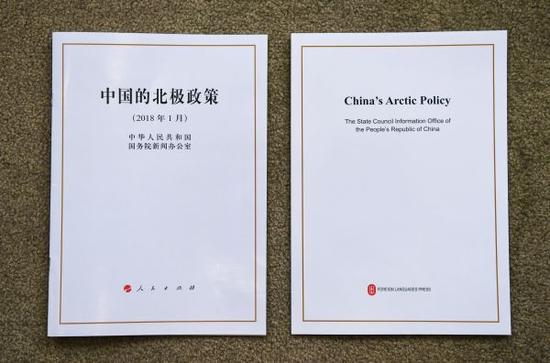 資料圖片:《中國的北極政策》白皮書中文版(左)和英文版(1月26日攝)。新華社記者 申宏 攝