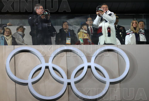 2月25日,韓國總統文在寅(前右)與國際奧委會主席巴赫(前左)在2018年平昌冬奧會閉幕式上。(新華社記者白雪飛攝)