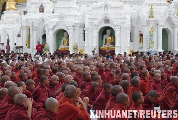 9月24日,在緬甸的仰光,僧侶們參加示威游行。緬甸仰光市數萬名僧侶和市民當天走上街頭,舉行近期最大規模的示威游行。此次示威是自18日以來,仰光僧侶游行的最新升級行動,也是市民首次較大規模參與的示威游行。游行的標語口號是:改善民生、釋放政治犯、實現民族和解等。 新華社/路透
