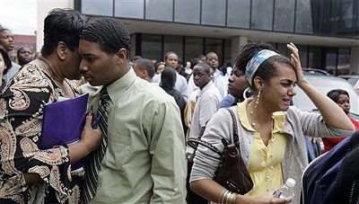 學生家長在得知發生槍擊案后,紛紛趕到學校打聽孩子的下落。由于警察仍在校內進行調查,他們只能在校外等候。學生們走出校園后,不少人淚流滿面,和家長擁抱在一起,也有人雙手顫抖地撥打手機和家人聯絡。