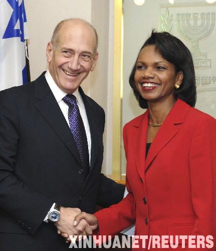 10月14日,以色列總理奧爾默特(左)在耶路撒冷會見到訪的美國國務(wù)卿賴斯。賴斯當(dāng)日上午在抵達以色列開始新一輪中東外交斡旋時說,她此行旨在為11月召開的中東問題國際會議做準備,敦促以色列和巴勒斯坦政府在草擬聯(lián)合聲明的過程中盡量減少隔閡。但她預(yù)計這次外交斡旋成果將有限。 新華社/路透