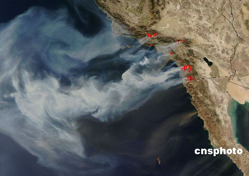 資料圖:美國太空總署十月二十三日公布衛(wèi)星照片顯示,加州火災在又熱又干的狂風紅旗警報中,第三天蔓延至大小火場二十二處。目前大火將約一千平方公里化為焦土,近50人受傷,燒毀1300所房屋,50多萬人被緊急大轉移到體育館和學校里避難。 中新社發(fā) 賈國榮 攝