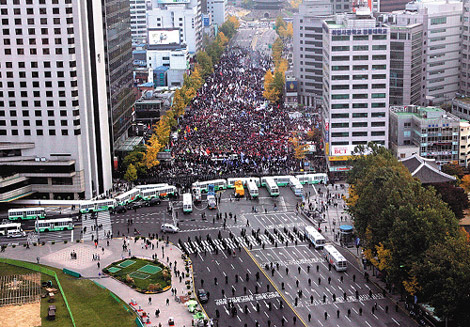 11月11日,韓國數萬人在首都示威,引發大規模沖突。