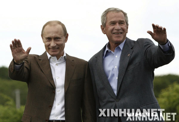 資料圖片:7月1日,在美國東北部緬因州肯納邦克波特,美國總統(tǒng)布什與到訪的俄羅斯總統(tǒng)普京一起揮手致意。 新華社發(fā)