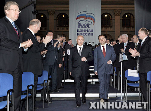 12月17日,在俄羅斯首都莫斯科,俄總統普京(中左)與第一副總理梅德韋杰夫(中右)共同步入統一俄羅斯黨代表大會會場。普京當日表示,如果梅德韋杰夫當選總統,他準備出任政府總理。 新華社發