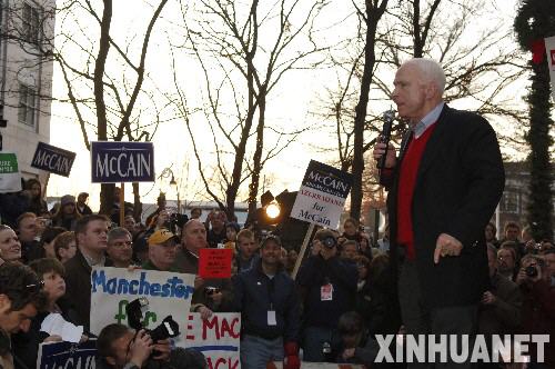 1月7日,美國共和黨總統競選人、亞利桑那州國會參議員約翰·麥凱恩(右)在新罕布什爾州的曼徹斯特發表競選演說。新罕布什爾州將于8日舉行2008年美國總統選舉的直接預選。 新華社記者張巖攝