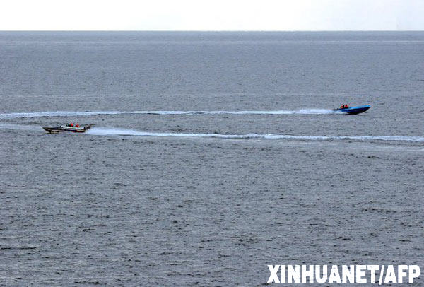 這是美國海軍1月6日公布的照片,顯示被懷疑為伊朗革命衛隊的快艇1月6日在霍爾木茲海峽國際水域的美國軍艦附近游弋。1月8日,美國總統布什稱,6日美國和伊朗艦艇在霍爾木茲海峽水域對峙事件是伊朗對美國的挑釁。 新華社/法新