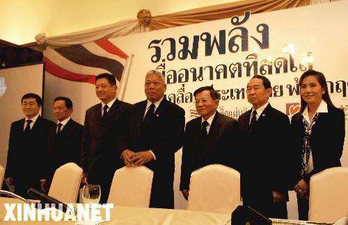 1月19日,泰國人民力量黨主席沙馬(左四)等人出席在曼谷舉行的新聞發布會。當天,泰國人民力量黨、泰國黨、為國黨、中庸民主黨、泰人同心發展國家黨和人民黨的代表在新聞發布會上宣布聯合組閣。 新華社記者凌朔攝